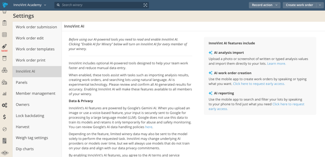 An account admin must use the InnoVint AI settings page to opt into AI features. If AI features have been activated on the Setting page, then all users with write access (Team Member, Team Member Cannot Submit and Admin) will see the AI Analysis Import action, and any other activated AI features.