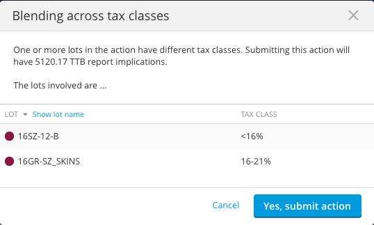 Volume that was transferred into a lot with a different tax class via any movement action. The volume inherits the tax class of the lot that it is blended into. E.g. Topping wine volume inherits the tax class of the topped lot and blended wines inherit the tax class of the blend lot. To properly populate line 20 (and it's counterpart, Line 5), find more information here.