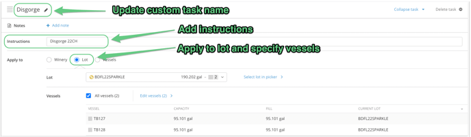 - Record it as part of the disgorge custom action/task in the instructions, or create a standalone custom action/task. This may be especially helpful if you do not want the bottled lot composition to reflect a dosage component.