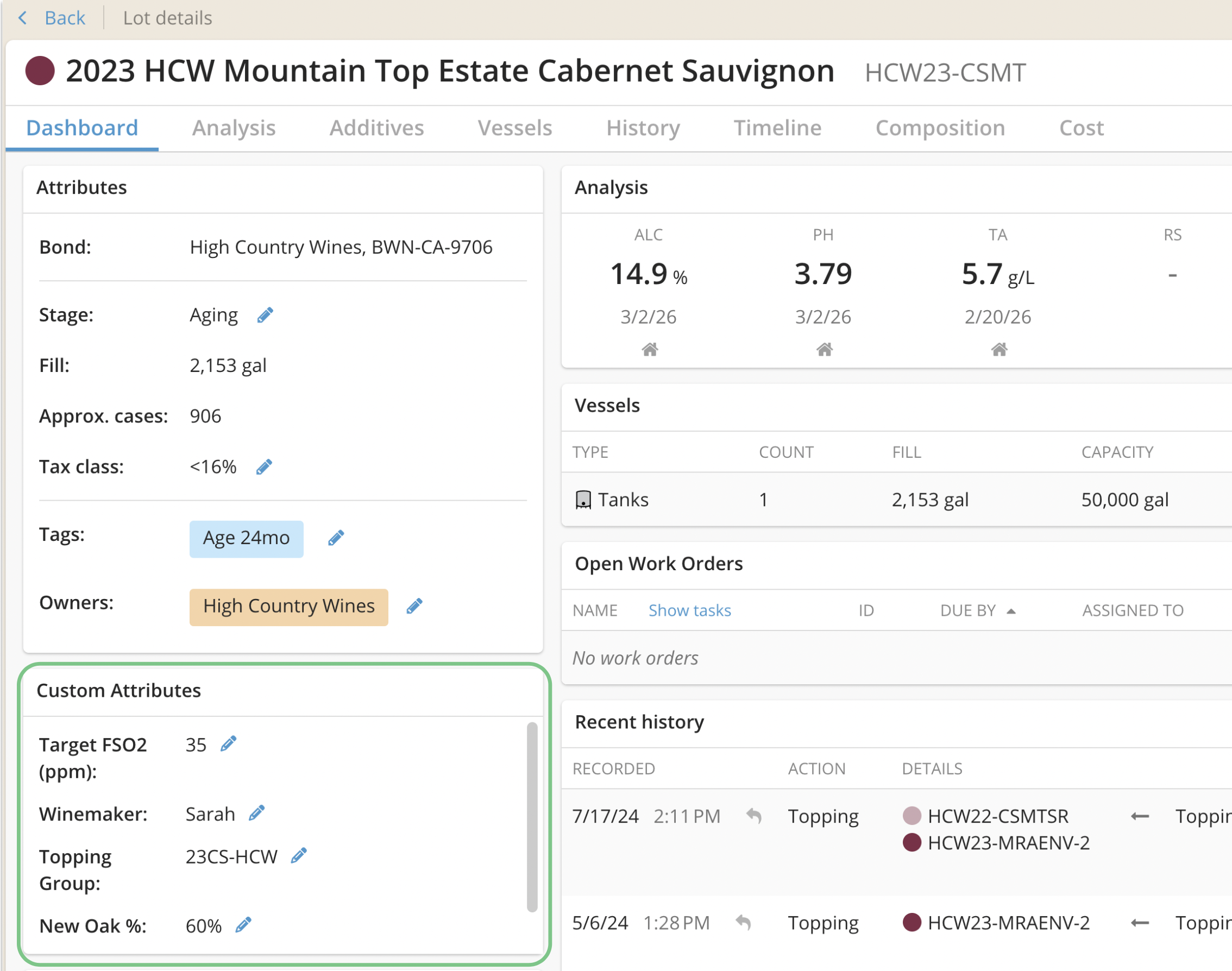 Once created, Custom Attributes can be: added to lots and viewed on the Lot Details page, and are included in the Lot Explorer, Custom Reports, and other additional report exports. This allows you to track the information that matters most to your winery and integrate that data more easily into your workflows.