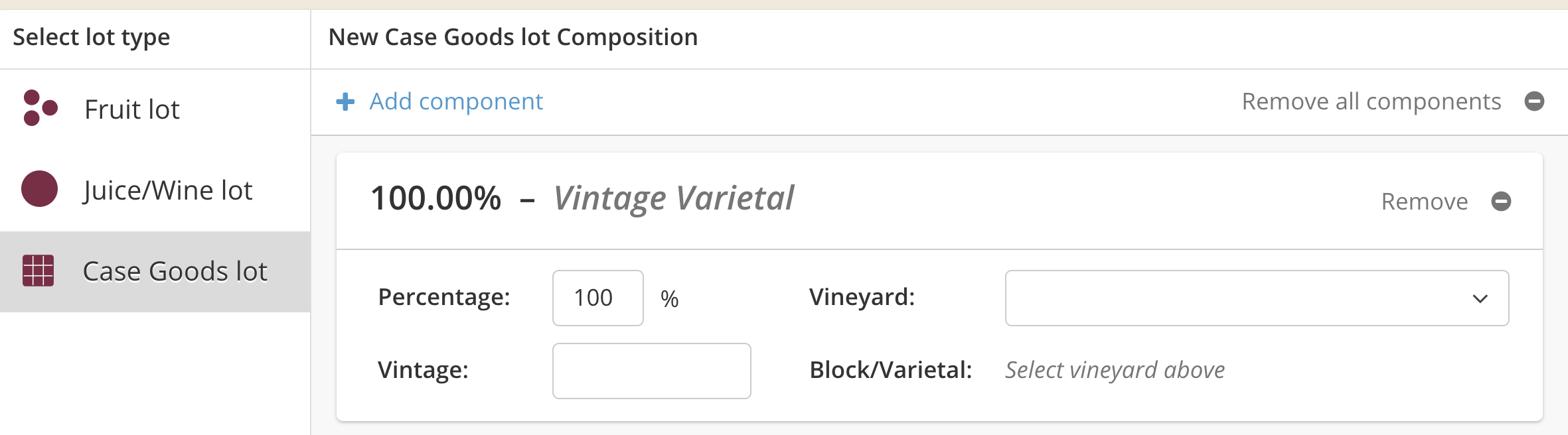 However, bulk components are not supported for case good lots that are created from "scratch." To create a new case goods lot you must use vineyard components.