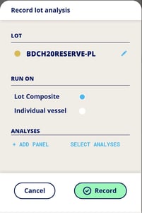 - To record lot analysis, select your lot and choose whether to record the analysis as Lot Composite or Individual vessel type analysis.