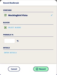 Add Note, Analysis, Vineyard Event and Crop Estimate are all accessible via the Record Action button in both the Vineyard and Block Detail pages. Analysis, Vineyard Events and Crop Estimates are all applied at the Block level. A Note is applied to the Vineyard OR to the Block, depending on where you access the Record Action button.
