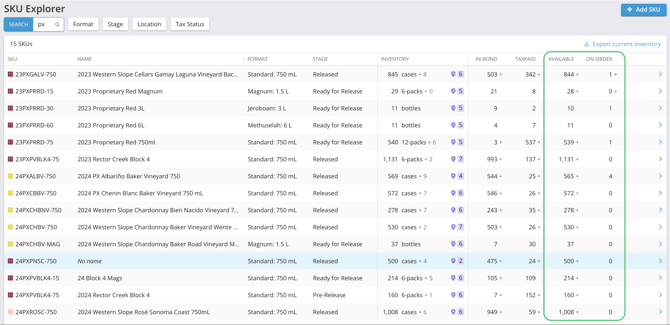 The term for ‘available’ inventory status in Commerce7. It refers to inventory that has not yet been sold and is available to be sold. - Available inventory